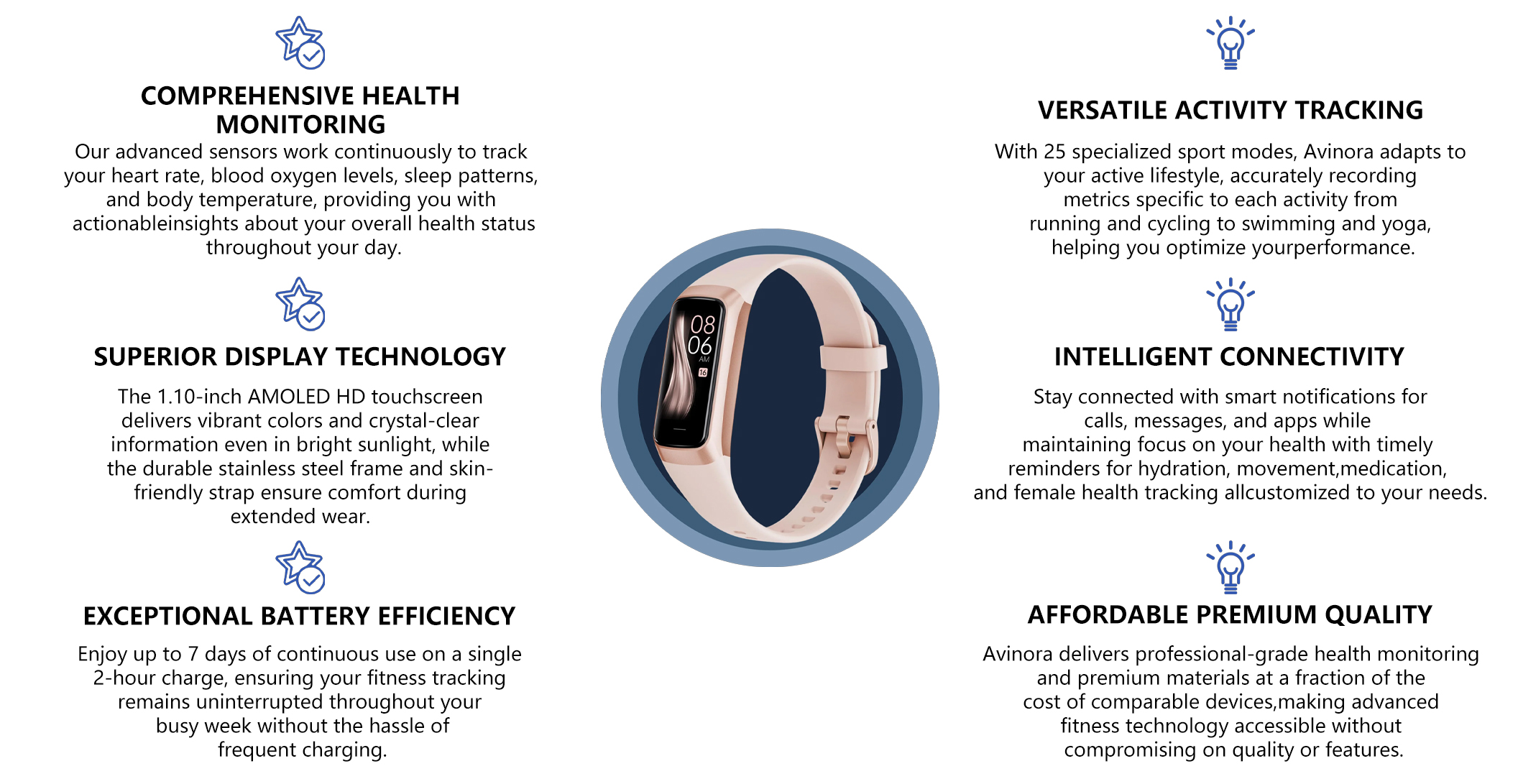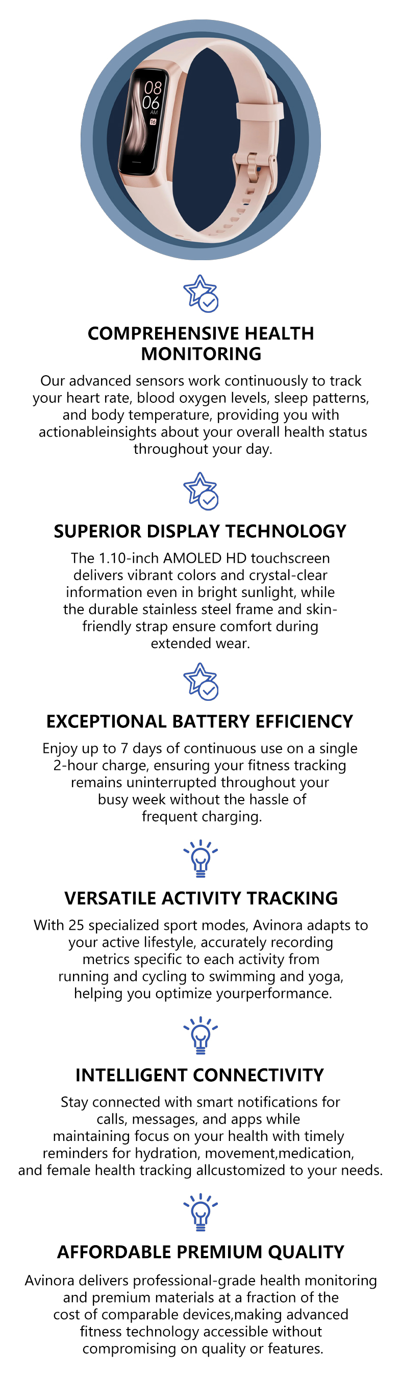 The Avinora  fitness tracker combines advanced health monitoring with intelligent features in a sleek, comfortable design that supports your wellness journey from sunrise to sunset.