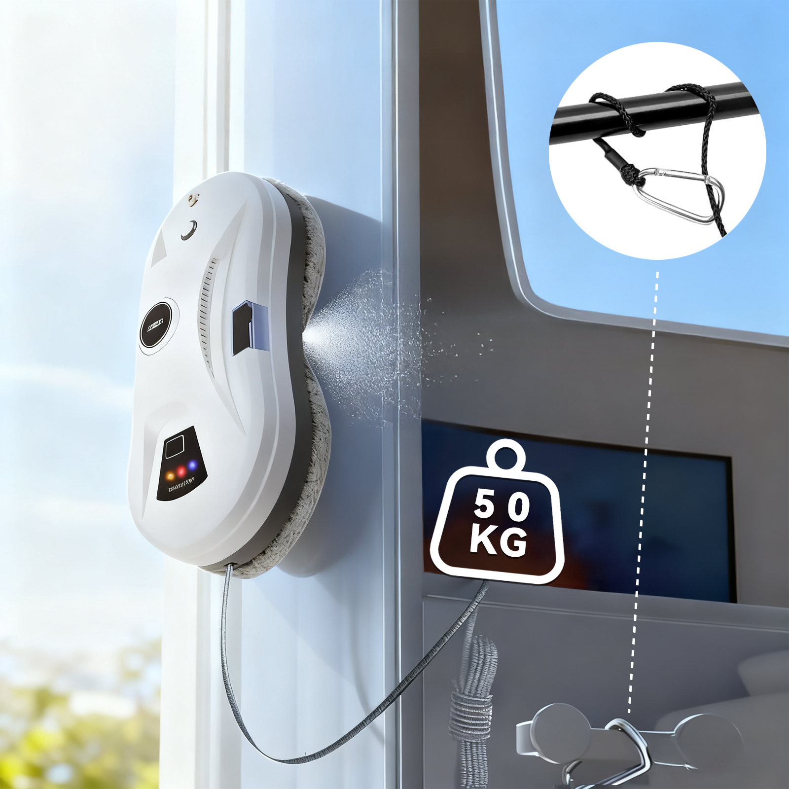 The robot is equipped with a high-strength safety rope boasting a load capacity of up to approx. 1764 ounces (50KG), which far exceeds the robot's own weight. This massive safety redundancy, combined with the 20-minute UPS power-loss protection, creates a double layer of insurance. You can completely eliminate any worry about the robot falling during high-altitude operation and enjoy truly worry-free cleaning.